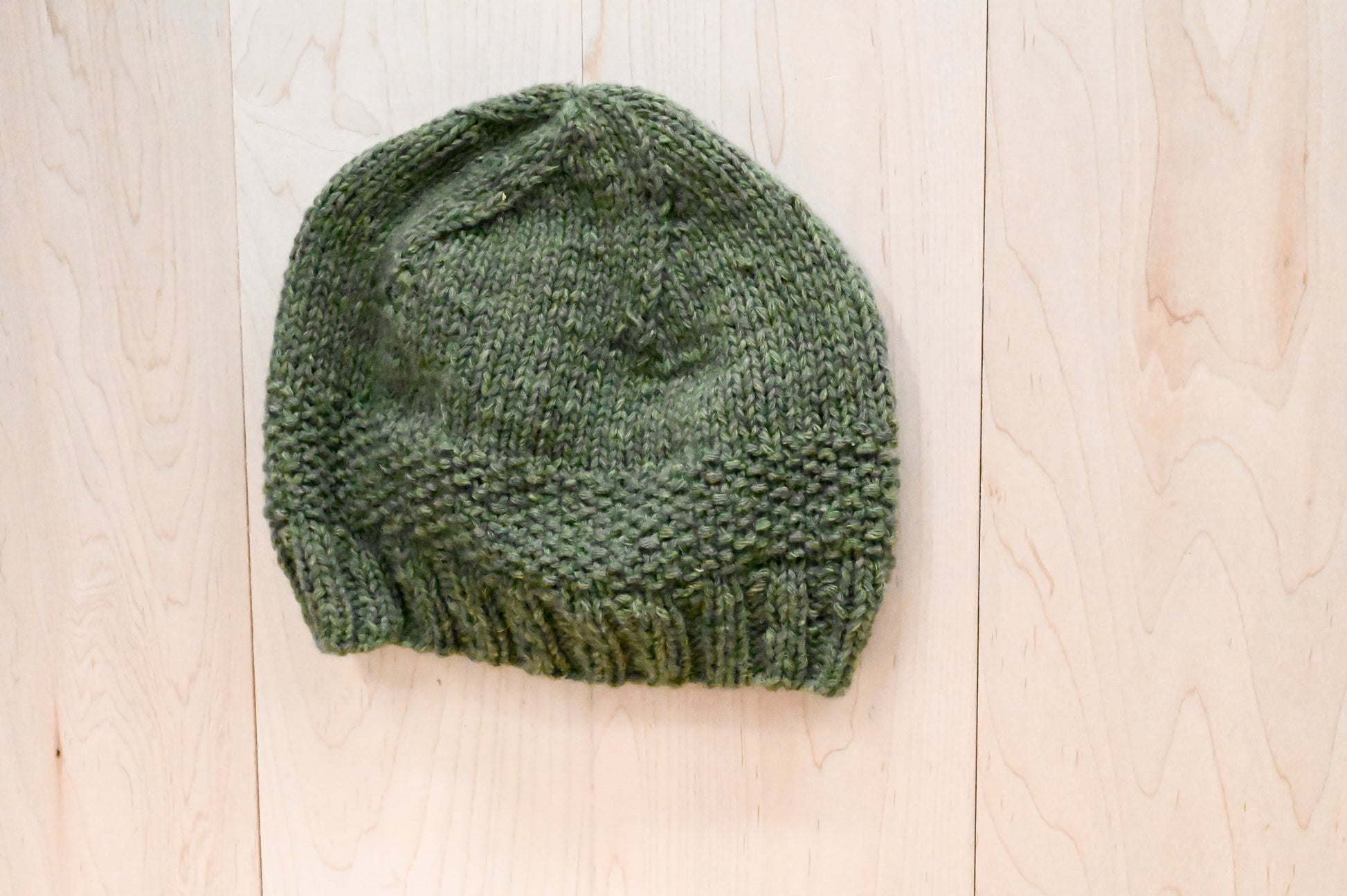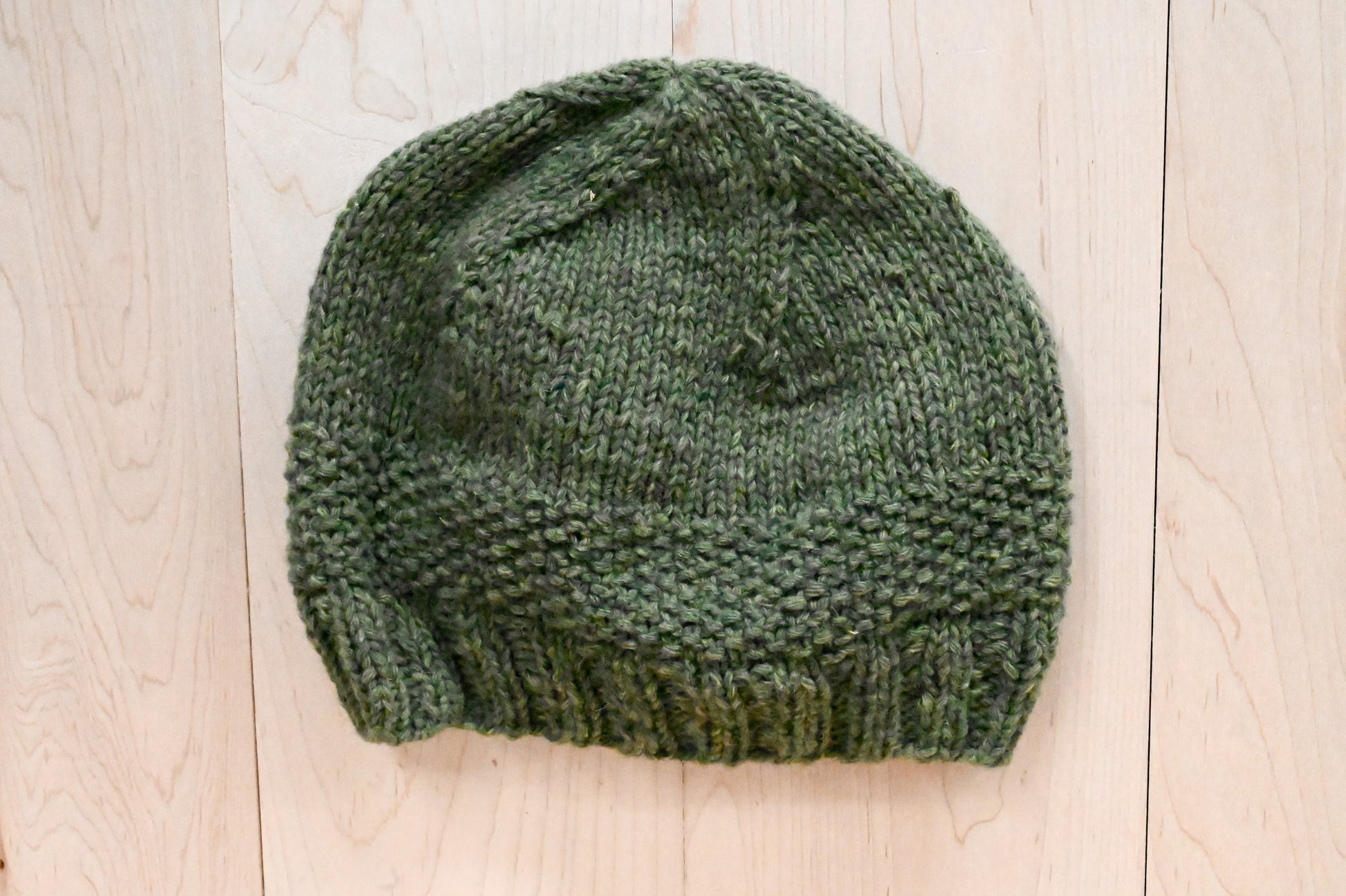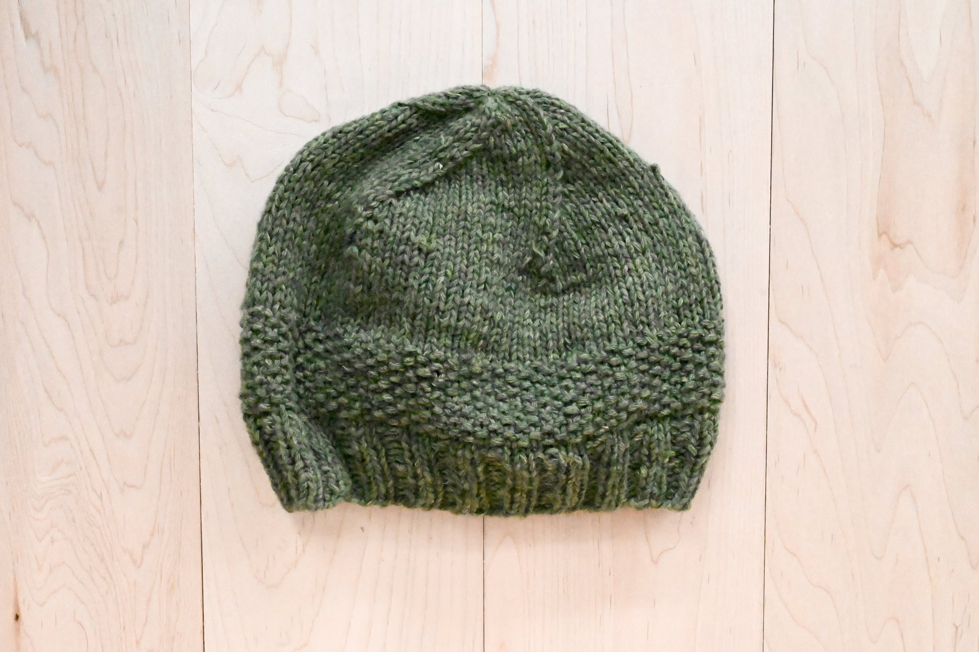 This beanie has lots of texture and uses all upcycled materials! The piece is a dusty forest green, and has a ribbed brim followed by a band of bumpy seed stitches, then smooth fabric leading into a spiral on the crown. With the textures and colors, it's reminiscent of light filtering through a forest canopy into the darker interior. I made the yarn by hand from upcycled materials (80% wool, 20% polyamide) and knit it by hand in a smoke-free environment. This hat is unisex and sized for an adult. Enjoy!