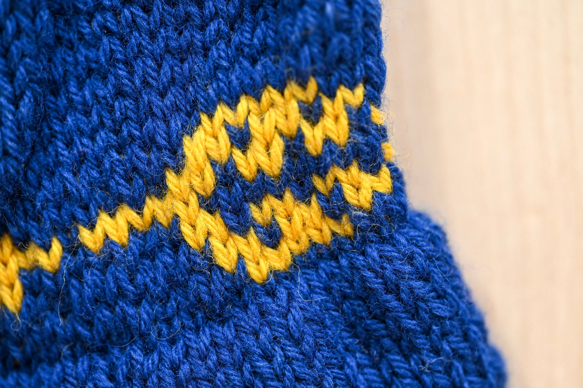 This soft wool hat has a cloche structure and a striking design of golden leaves over vibrant royal blue. The hat uses a gather-like technique at the top to add dimension and movement, and to balance the long soft brim at the bottom. The brim of the hat is double-layer and has a luxurious feel. This hat is unique in design and soft to the touch. I got the yarn from a local yarn supplier and knit it by hand in a smoke-free environment. It's unisex and sized for an adult. Enjoy!