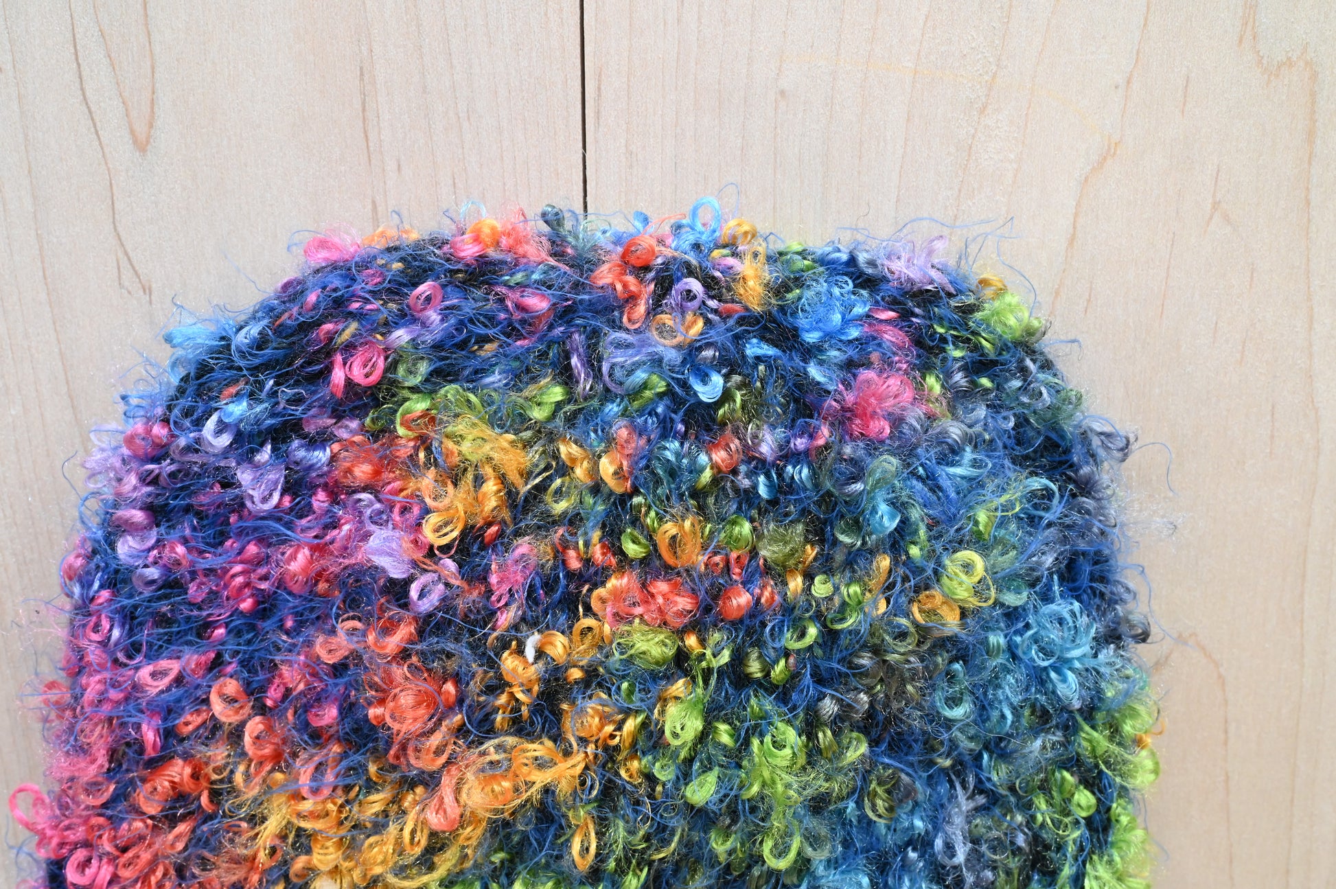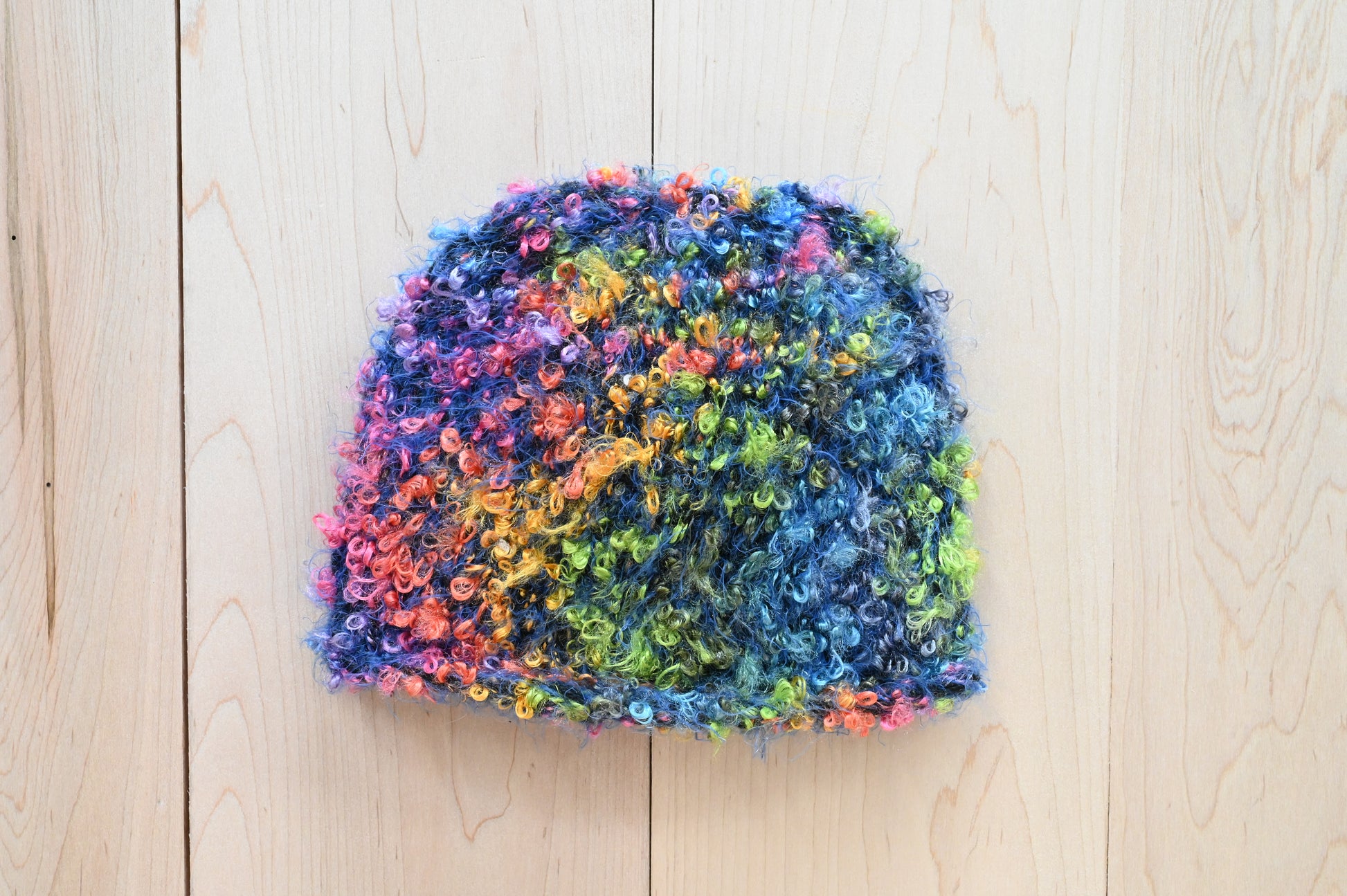 This hat is super fun and textured. It uses a machine-washable blend of fibers to create a soft, loopy texture with a dense internal fabric for warmth and structure. The hat has a rolled brim on the bottom variegated colors throughout. All the materials in this hat are upcycled. It's unisex and sized for a child. Enjoy!