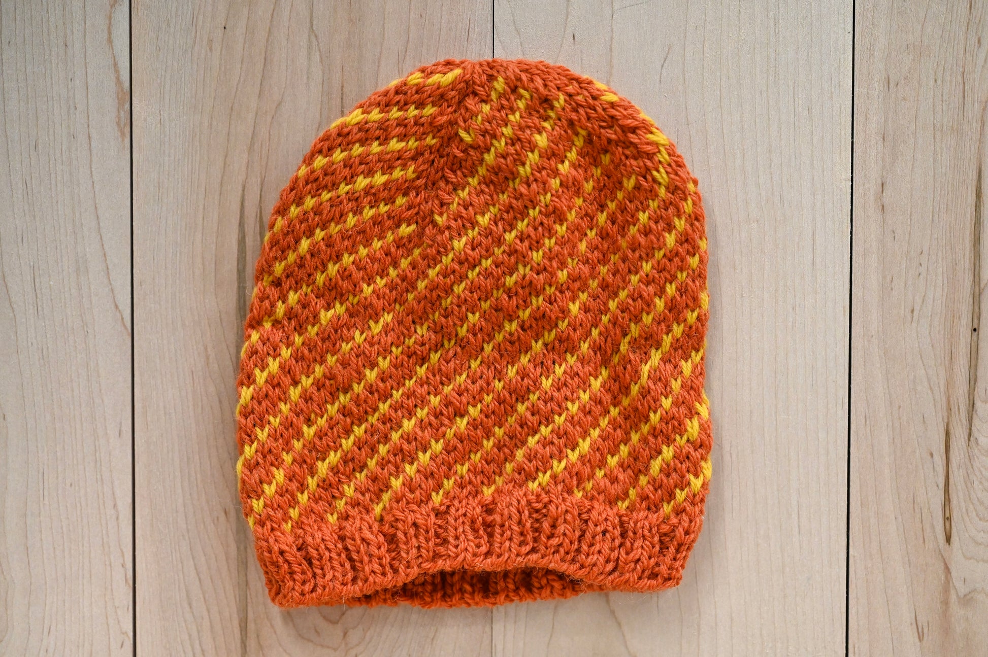 This colorwork hat has a narrow ribbed brim and a beautiful contrasting spiral up the top of the hat. The top is fairly long, so it'll be a great to wear either slouchy or with the brim rolled up. Because of the colorwork design, the fabric of the hat is quite thick and warm, but the fabric isn't too dense to be comfortable. Instead, it's soft and plushy! The yarn for this hat came from a local yarn supplier and I knit it by hand in a smoke-free environment. It's unisex and sized for an adult. Enjoy!