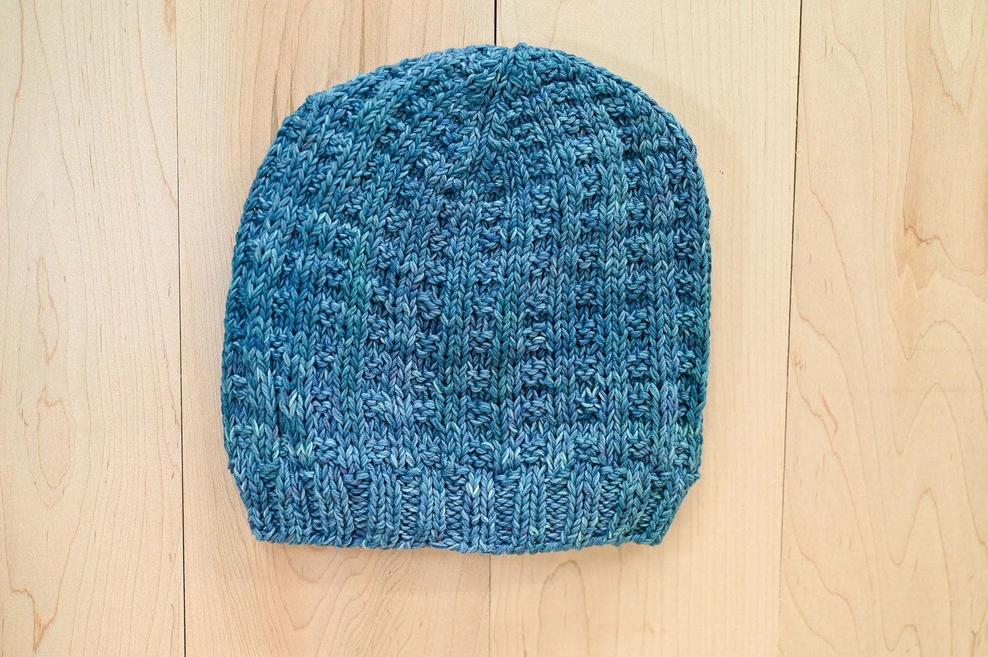 This hat uses organic cotton dyed with an awesome blue tonal design. It uses a waffle knit pattern and is really soft and plushy. The yarn was dyed by an independent yarn dyer before being shipped directly to Massachusetts, where I knit it by hand in our studio. This is a larger adult-sized hat and is unisex. Enjoy!