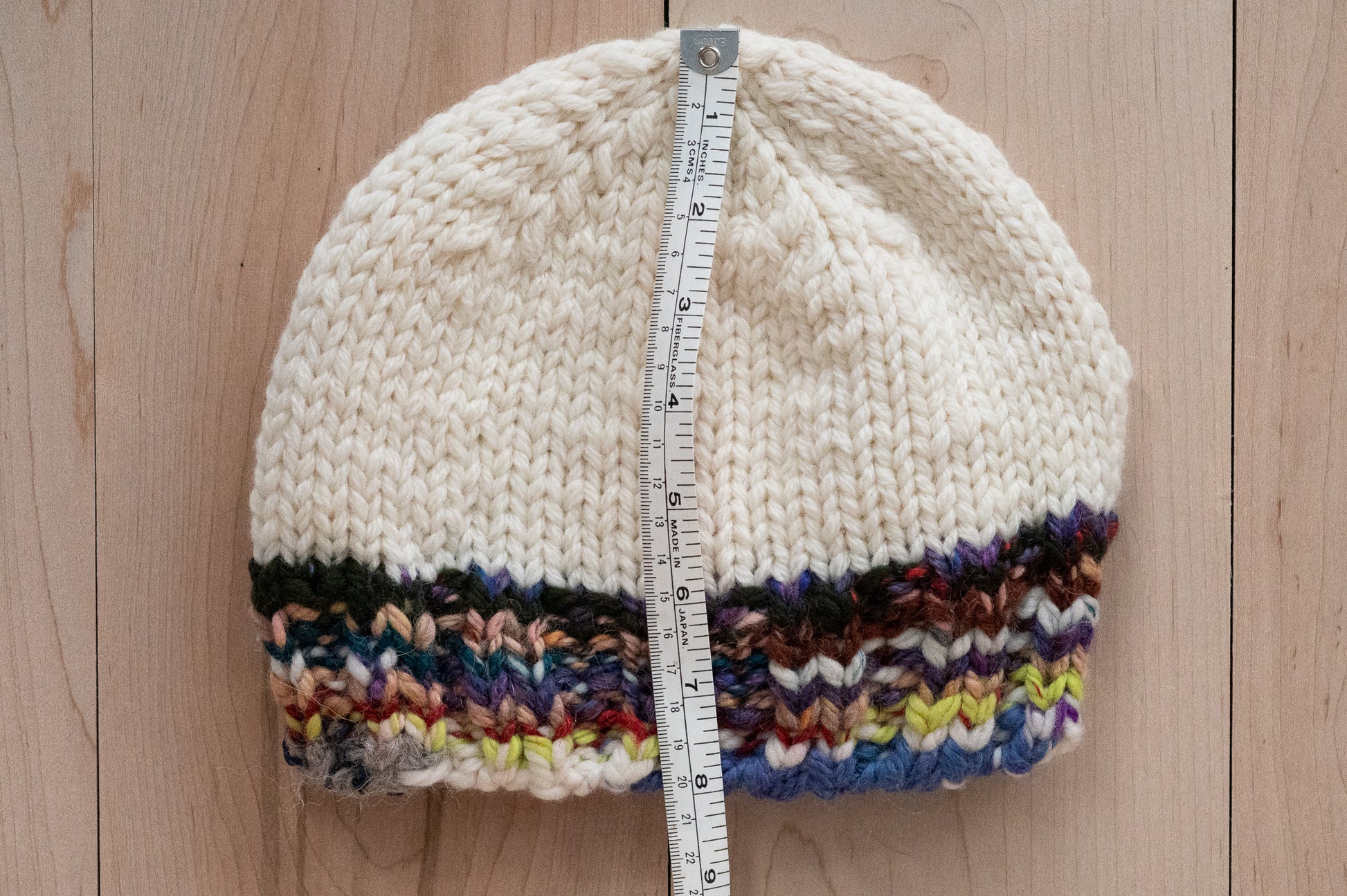 This fun, thick wool beanie has a soft, multicolor brim leading into a plushy white top and is all zero-waste. The brim uses waste handspun yarn and is incredibly soft to the touch. This hat is unique and visually striking, with high contrast and a lot of warmth. The white yarn on top is a secondhand white Merino wool, and the handspun yarn on the brim uses repurposed waste from the spinning process. We knit the hat by hand in Massachusetts in a smoke-free environment. It's sized for an adult and on the bigger side. Enjoy!