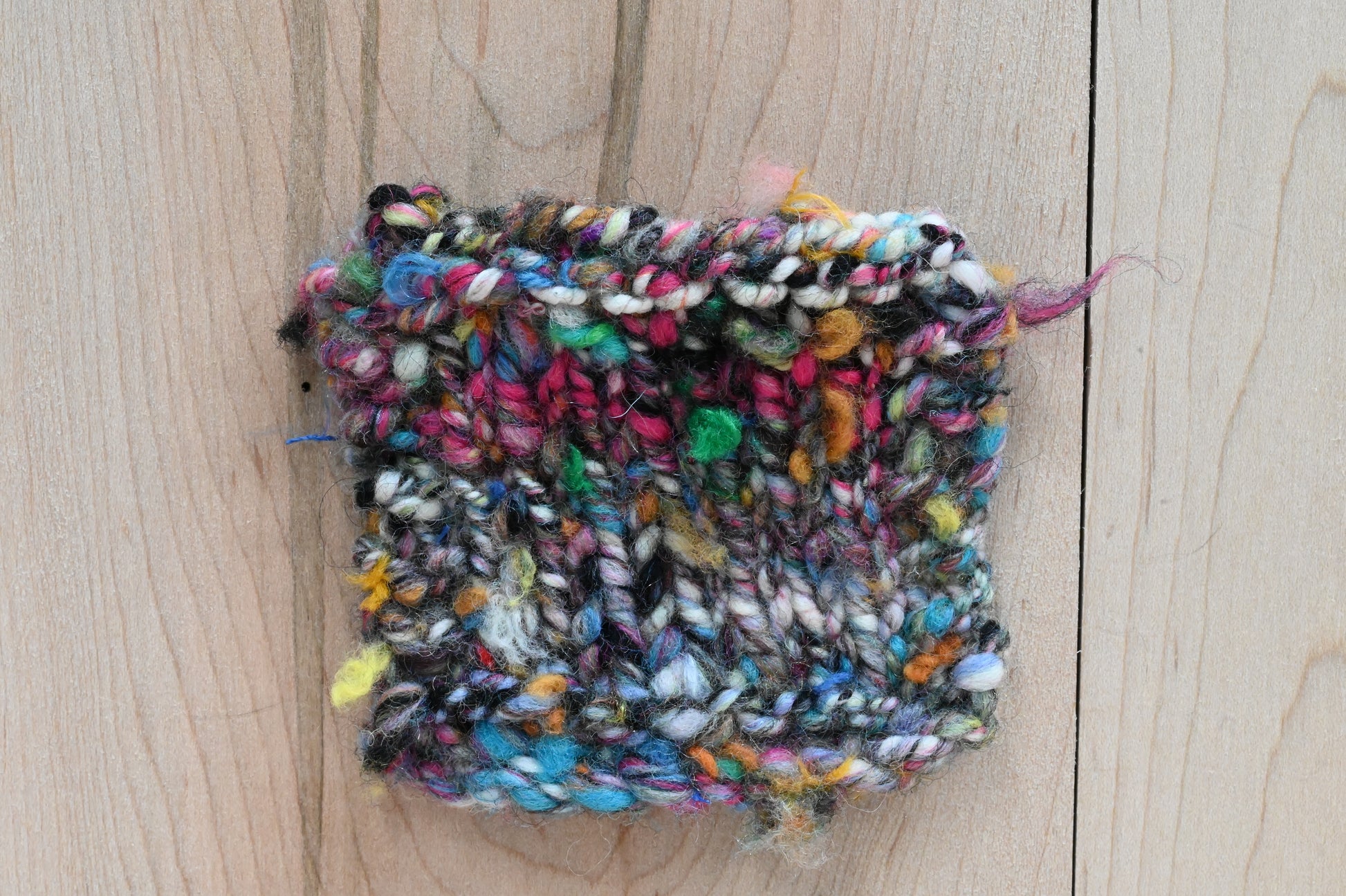 This high-contrast, handspun art yarn features a mix of bright colors and mixed grays, with bright, multicolor inclusions of varying textures. It's vibrant and dynamic, with a lot of thick-and-thin variation in weight and diverse textures and colors. The inclusions (bits of extra fiber spun in for variety) use upcycled textile waste of varying fibers. The base wools for this yarn were processed sustainably, using environmentally-friendly detergents and dyes. I blended the fibers by hand using my drum carder, then spun it on my Electric Eel Wheel from Dreaming Robots. Enjoy!